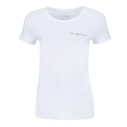 White ladies t-shirt, branded with the Google Cloud logo to the left. 100% Organic cotton.